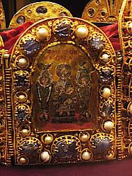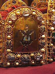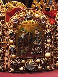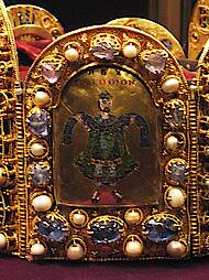 Die vier Bildplatten der Reichskrone stellen David, Salomo, Hiskia (mit dem Propheten Jesaja) und Christus als Weltenherrscher (Majestas Domini) dar.