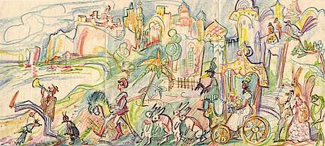Farbige Handzeichnung von Fritz Hanel zur Geburt der Freundestochter Karin Godzik in einem persönlichen Brief an den acht Jahre jüngeren Breslauer Schulkameraden Helmut Godzik, der nach dem Krieg mit seiner Familie in Flensburg-Mürwik lebte. Fritz Hanel und Helmut Godzik schrieben sich von 1946 bis 1951 regelmäßig.