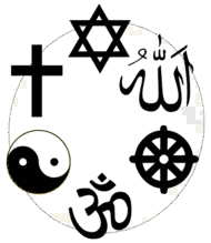 Symbole der "Weltreligionen" im Uhrzeigersinn: Judentum, Islam, Buddhismus, Hinduismus, Taoismus, Christentum.
