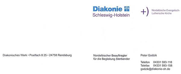 mit Wirkung vom 1. Januar 2008 bin ich für 3 ½ Jahre zum Nordelbischen Beauftragten für die Begleitung Sterbender in Verbindung mit dem Diakonischen Werk in Rendsburg ernannt worden. Meine Aufgabe wird es sein, das bestehende Netzwerk der Palliativmedizin und Hospizversorgung in Schleswig-Holstein und Hamburg zusammen mit den dafür bereits Tätigen und Verantwortlichen zu stärken und zu unterstützen.