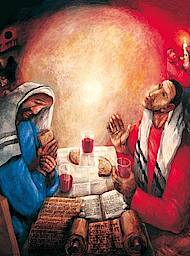 Die Entscheidung, in einer belastenden Situation auszuhalten, erfordert Mut und Kraft und eine klare Entscheidung. Als Jesus im Garten Gethsemane seine Jünger bittet, mit ihm zu wachen, flüchten sie in den Schlaf. In der Emmausgeschichte bitten die Jünger den Auferstandenen: "Herr, bleibe bei uns!" Er, der sich soeben zum Weitergehen anschickte, läßt sich zum Bleiben bewegen. An diesem Abend verdichtet sich die Gemeinschaft, die auf dem Weg begonnen hat. Der Gast bricht das Brot. Beim gemeinsamen Essen erkennen sie ihn. In diesem Augenblick verstehen sie auch die Zusammenhänge, verwandelt sich ihre Trauer in Frieden, Gewißheit und Freude.