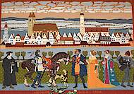 Der Gobelin stellt das Panorama von Löwenberg in Schlesien im 16. Jh. dar, mit einem Blick auf die große Mauer dieser malerischen Stadt in den Strahlen der untergehenden Sonne. Die über die Stadtmauern hinausragenden Gebäude wurden in ihrer Zeichnung und Stimmung in der Konvention alter Holzschnitte ausgesprochen subtil behandelt. In der Ferne konnte man den von niedrigen Hügeln, über denen sich ein wolkenbedeckter Himmel wölbt, umschlossenen Raum erblicken. Auf einem in einiger Entfernung von den Mauern führendem Weg wurden Vertreter der diversen Stände gezeigt. Unter ihnen ein Gelehrter, ein Ritter zu Ross mit Hund, zwei feierlich gekleidete Damen, ein Wanderer und ein Lehrling. Alle Personen sind in mittelalterlichen Gewändern dargestellt. Der besondere Wert der Komposition besteht in einer gekonnten Zusammenstellung der Schauplätze und der reichen Ornamentik. Der Gobelin aus Löwenberg zeichnete sich durch eine meisterhafte Ausführung und eine besondere Erzählstruktur aus. Leider gilt er seit dem Zweiten Weltkrieg als verschollen, er wurde vermutlich nach Russland ausgeführt und ist nur von Fotografien bekannt.