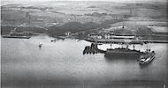 Sowohl der Stützpunkt der kaiserlichen Marine (rechts) als auch die Marineoffiziersschule (links) waren beliebte Postkartenmotive. Letztere ist noch immer das Wahrzeichen des Stadtteils, während die beiden alten Kasernen zwischen zahlreichen jüngeren Bauten der Marine heute kaum noch auffallen. Flensburgs seit 1910 nordöstlichster Stadtteil war damals noch dünn besiedelt. Über der Offiziersschule erkennt man Twedterholz, über dem Lazarettgebäude (die spätere Klinik Ost) kann man zwischen Bäumen den Hof Osbek ausmachen. Deutlich zu sehen ist in der Bildmitte das Wohnhaus der Osbek-Ziegelei am Wasser unterhalb des bewaldeten Hügels.